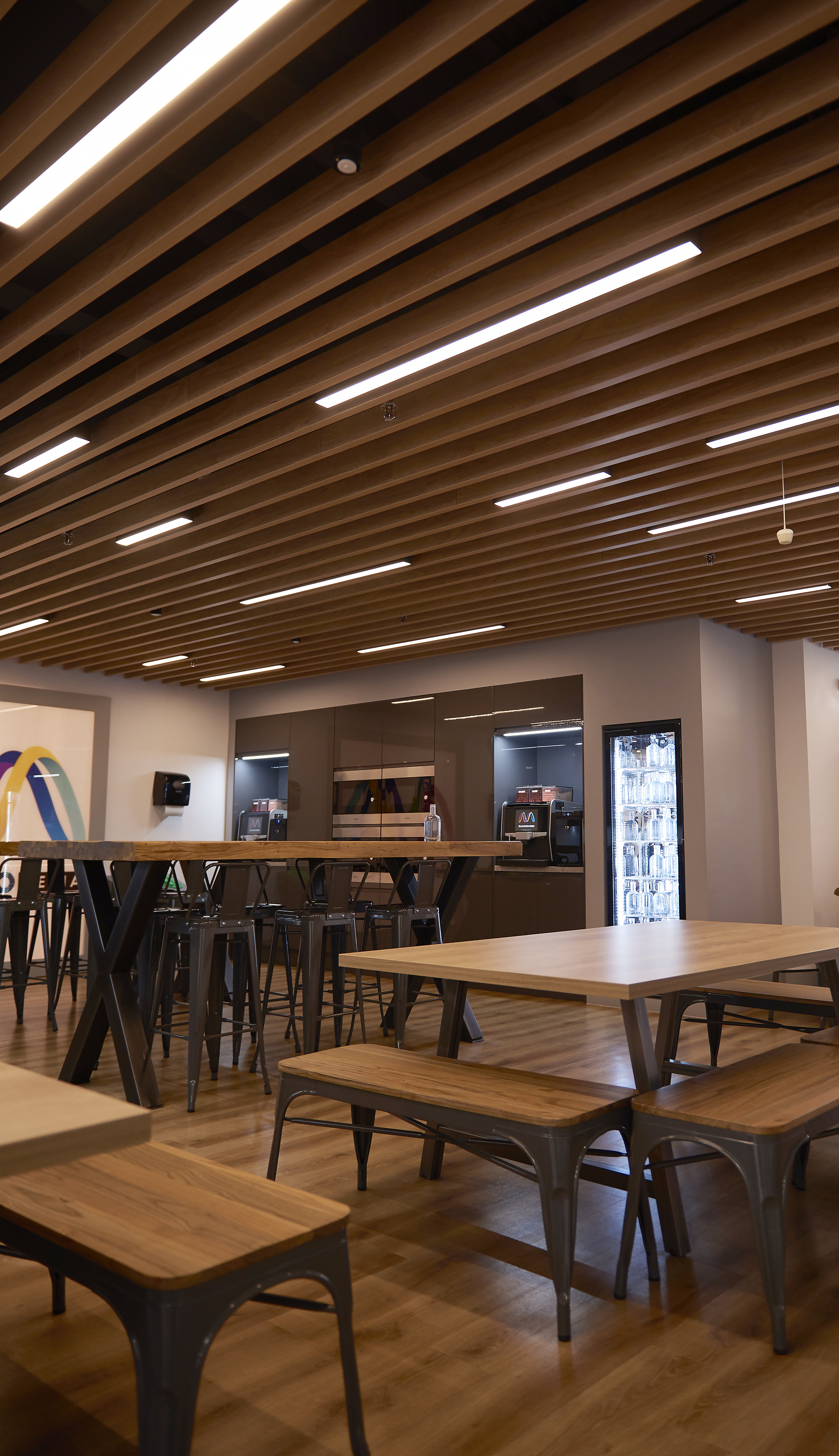 To create an enhanced lit environment with the use of the area in mind, each installation required a different colour temperature output. The Tech Bar required a cool clean light at 4000K and the more relaxing space in the Break Out Kitchens, a warmer white at 3000K.