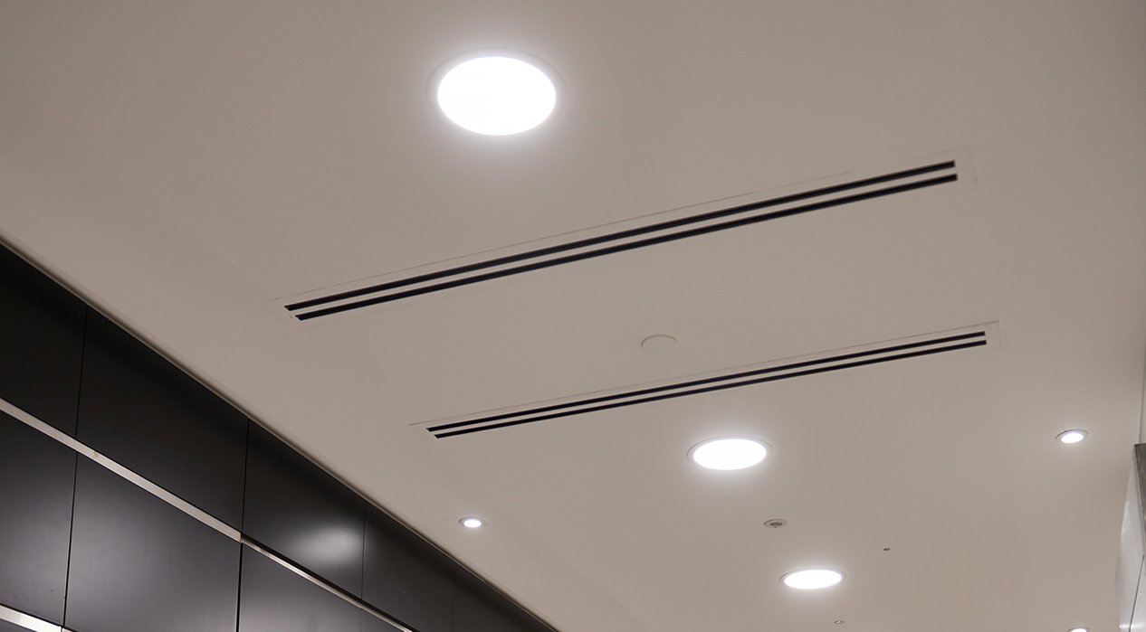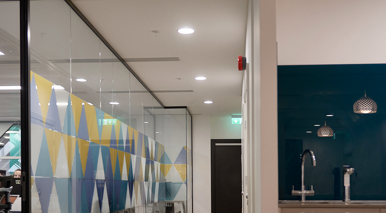 Carbon Downlights and Circular LuxPanels were installed in corridors and breakout areas. Carbon is an ideal replacement for compact fluorescent fittings and is designed to retrofit ceiling cut-outs of common traditional downlights.