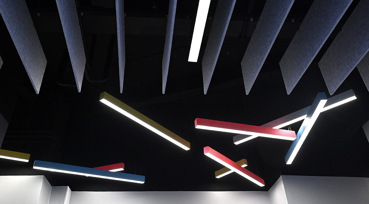 Luceco were delighted to design and supply Contour Suspended lighting in varied sizes in mulitcolour and black, creating a stylish and striking lighting solution for the communal seating area at Sumner House. Creatively installed in intervals between sculptural wooden slats, with further colourful lights artistically suspended to create a focal point, Sumner House shows the versatility of Luceco LED lighting solutions and the myriad of creative possibilities for installation.