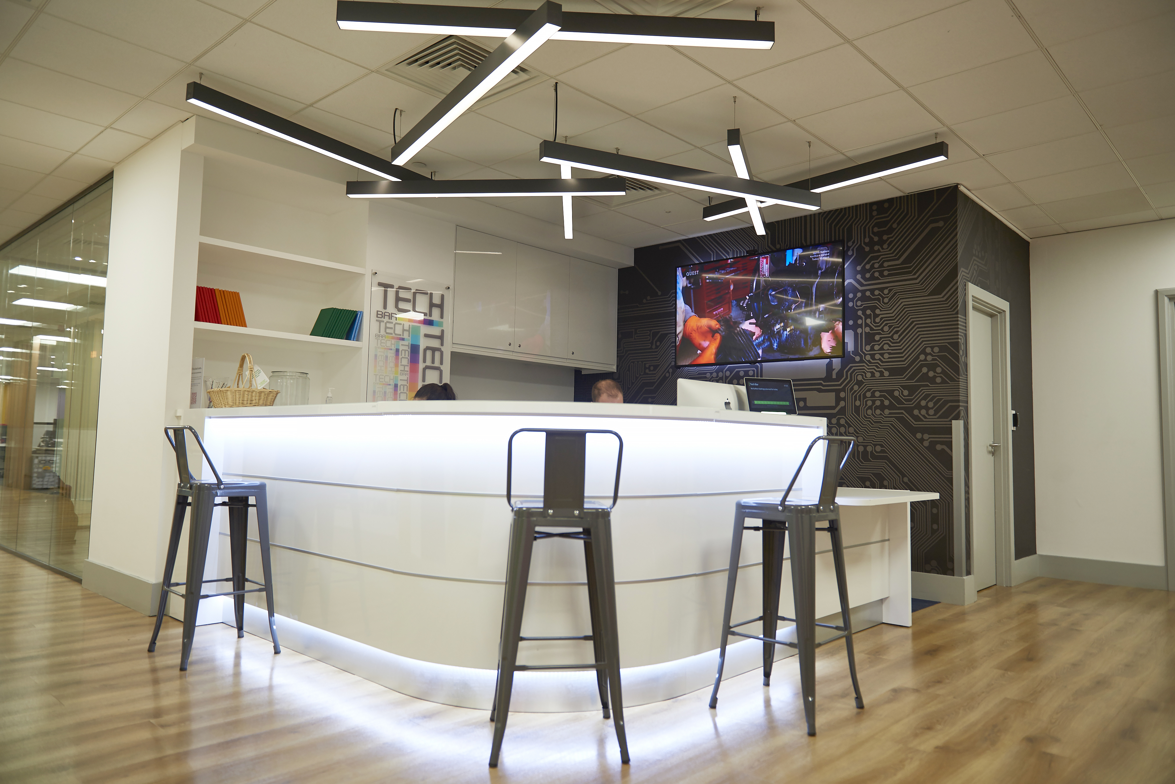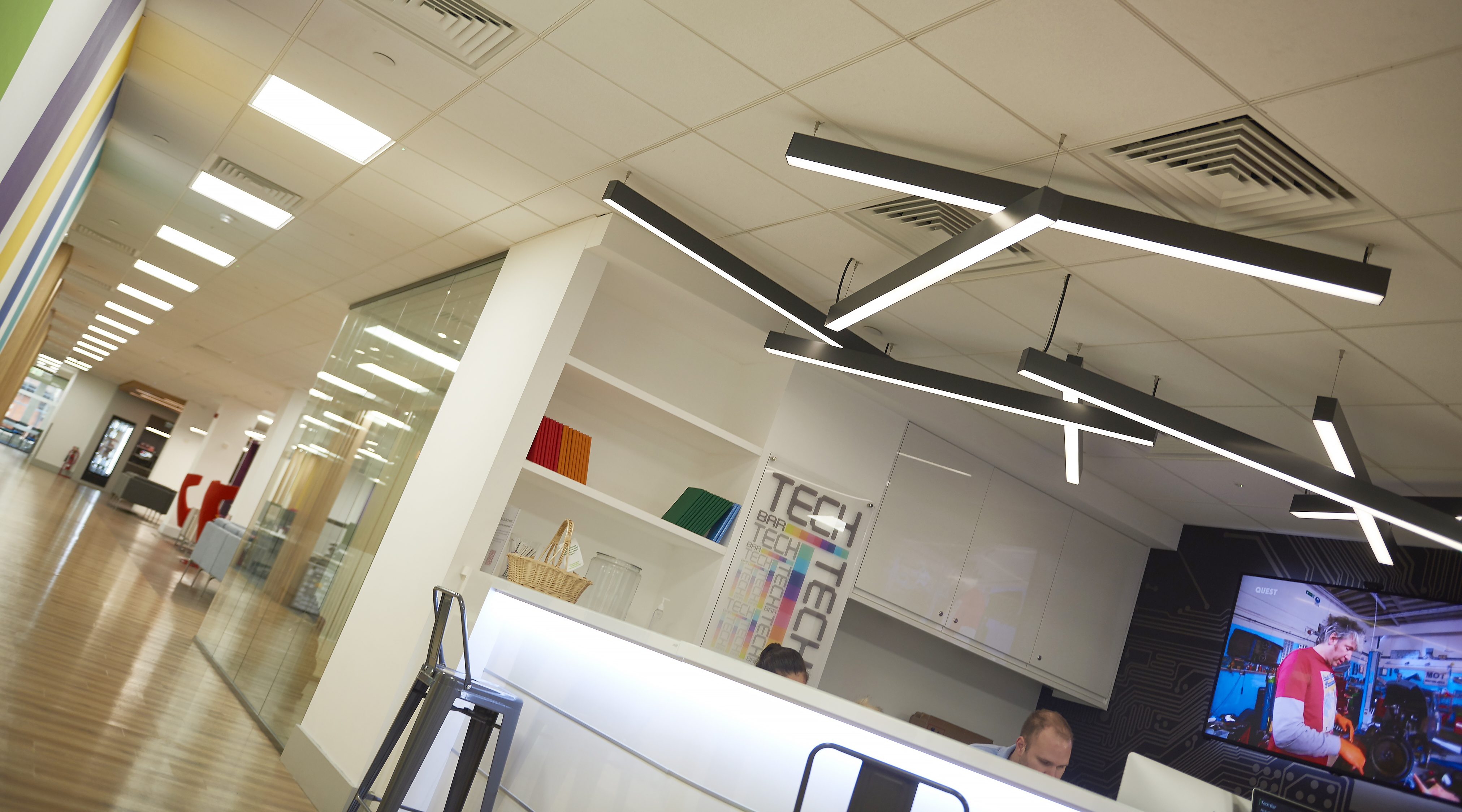 To create an enhanced lit environment with the use of the area in mind, each installation required a different colour temperature output. The Tech Bar required a cool clean light at 4000K and the more relaxing space in the Break Out Kitchens, a warmer white at 3000K.