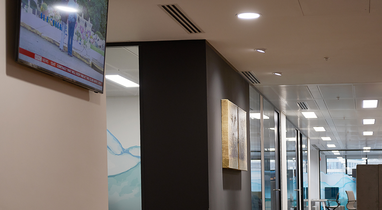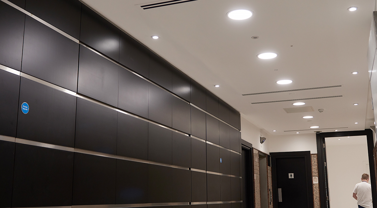 Carbon Downlights and Circular LuxPanels were installed in corridors and breakout areas. Carbon is an ideal replacement for compact fluorescent fittings and is designed to retrofit ceiling cut-outs of common traditional downlights.