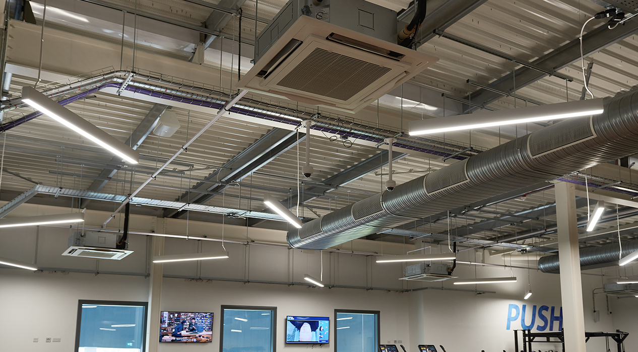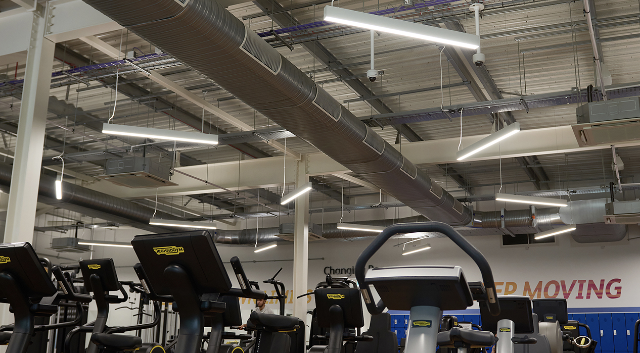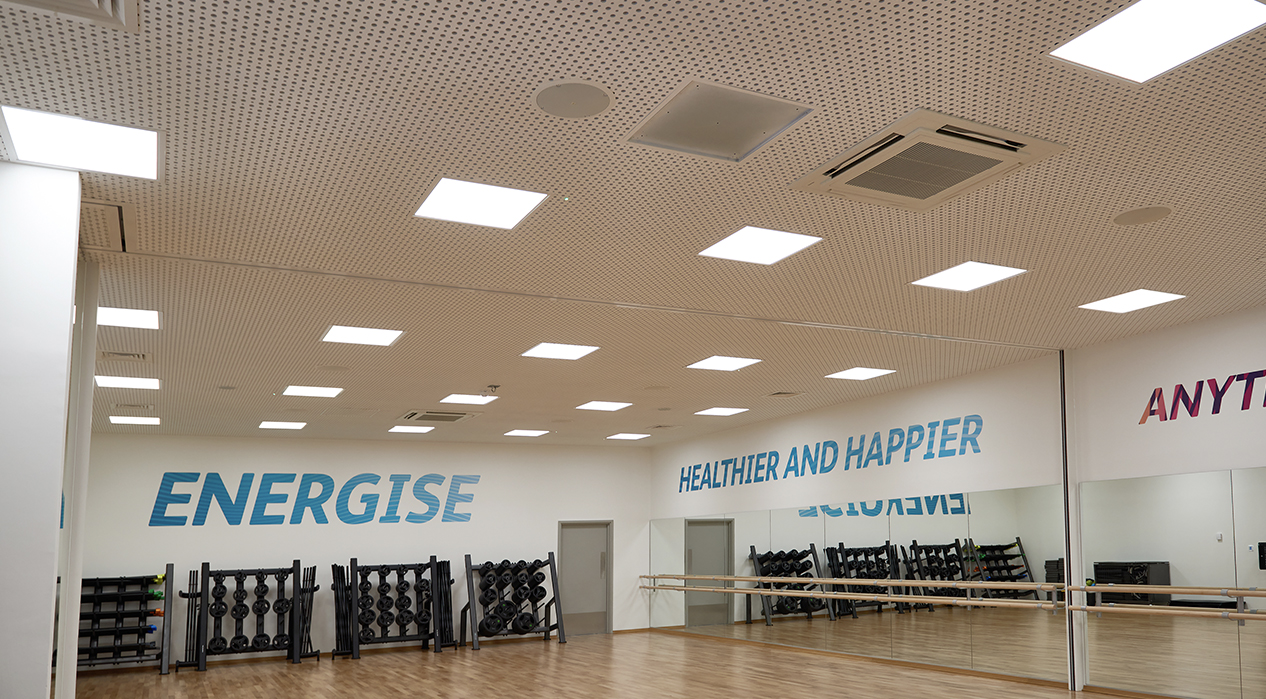 The gym at Lee Valley, along with the studios are now lit with a combination of recessed 600 x 600 LuxPanels and contemporary suspended Contour luminaires with the entrance hall displaying Platinum Downlighters.