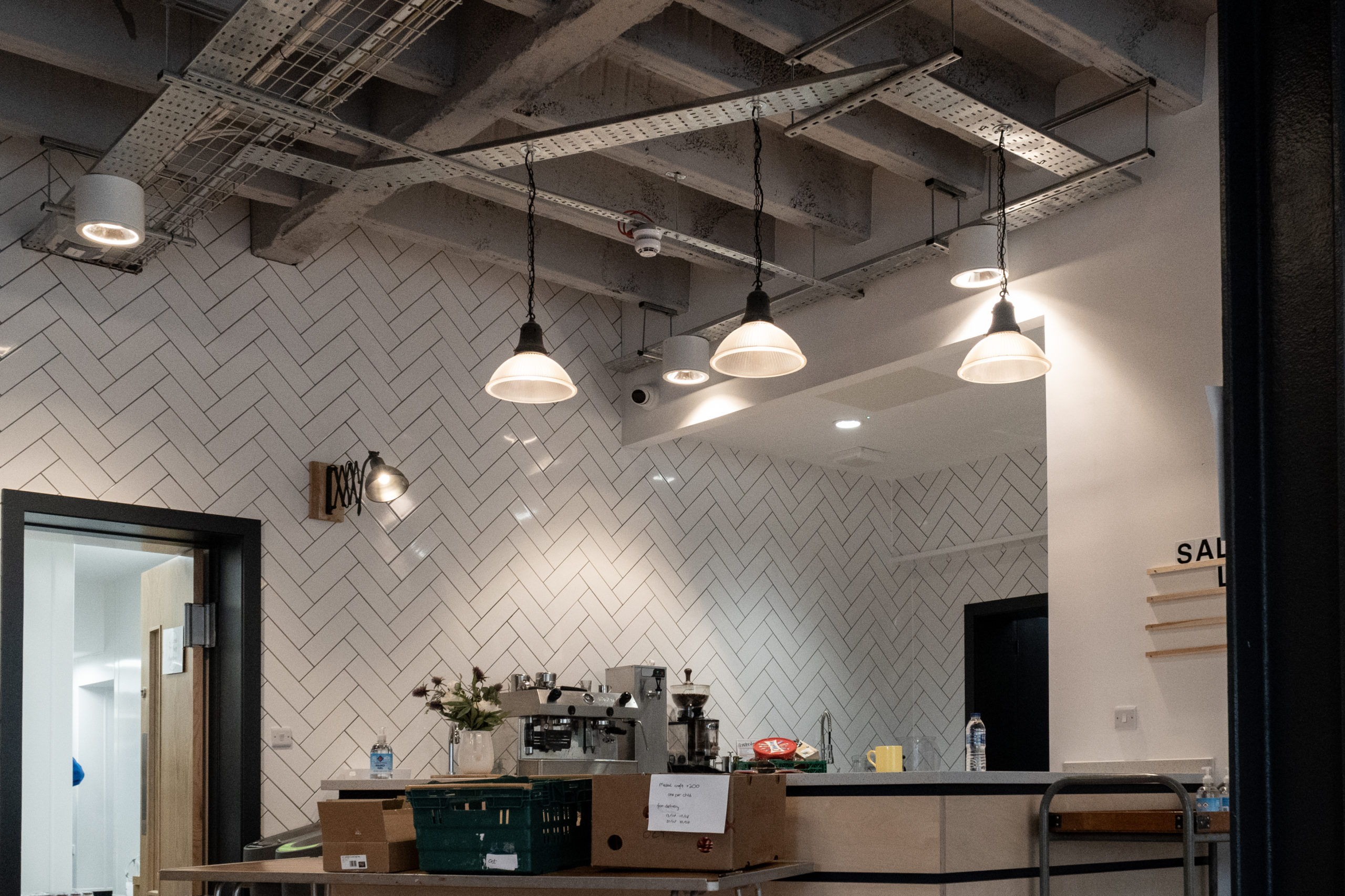Dimmable 3000K suspended LuxFrame luminaires were used in the main area. LuxFrame is a minimalist LED luminaire designed for ceiling grid applications or suspended as a pendant luminaire as at Salt House, enabling the creation of imaginative and contemporary lighting designs.